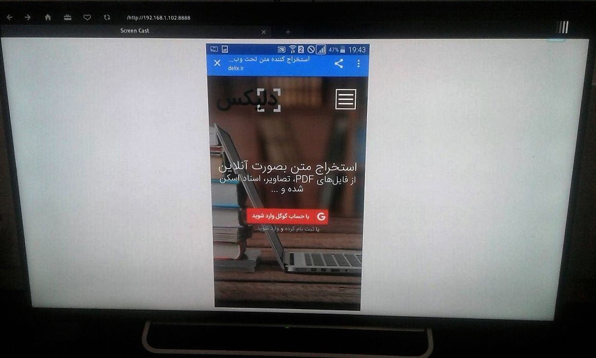 همچنین با استفاده از این روش میتوانید تصویر دستگاه اندرویدی خود را بر روی یک تلویزیون هوشمند که مجهز به مرورگر اینترنتی است نمایش دهید. کافی است تلویزیون هوشمند شما هم از طریق کابل LAN و یا امواج وایرلس به همان مودم وایرلسی که گوشی یا تبلت اندرویدی شما ارتباط دارد متصل شده باشد. همانند قبل میتوانید آدرس نمایش دادهشده در نرمافزار Screen Cast را در مرورگر اینترنتی تلویزیون هوشمند وارد کنید تا بلافاصله تصویر گوشی خود را بهصورت زنده و Live در تلویزیون هوشمند مشاهده کنید.
