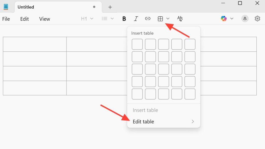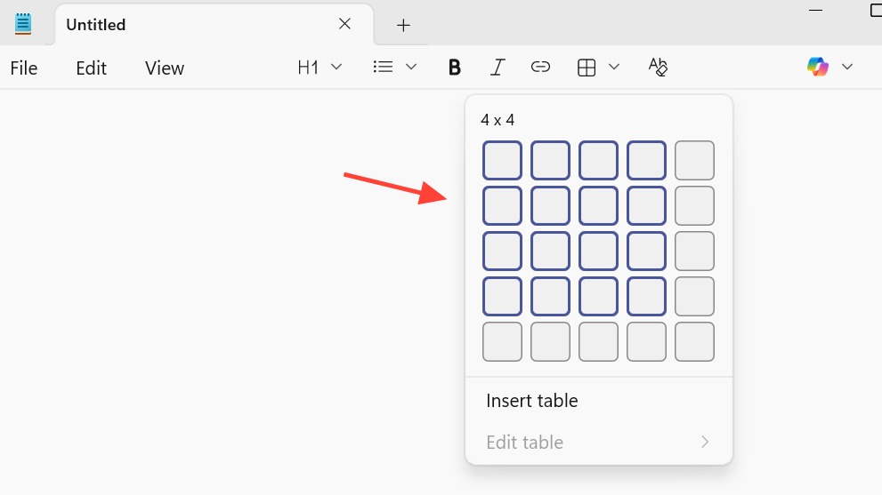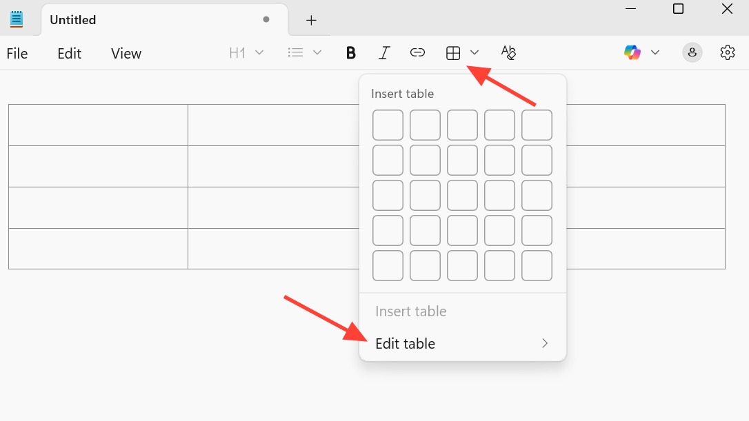 پس از اینکه جدولی در جای خود قرار گرفت، نوتپد کنترلهای اضافی را زیر همان دکمهی Table در اختیار شما قرار میدهد.