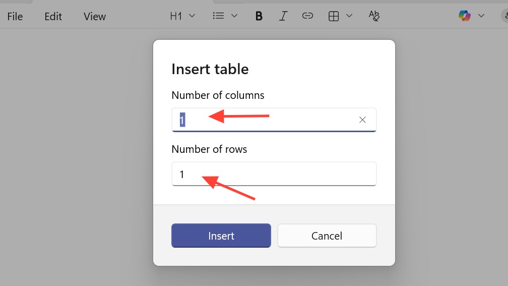 ۴. تعداد ستونها و سطرها را در پنجرهی دیالوگ وارد کنید.
