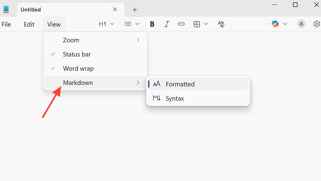 برای تنظیم این رفتار، تنظیمات نوتپد را از منوی برنامه باز کنید و به دنبال کنترلی بگردید که ویژگیهای قالببندی را مدیریت میکند. خاموش کردن قالببندی، کنترلهای جدول را همراه با سایر گزینههای متن مانند Bold و Bullet پنهان میکند.