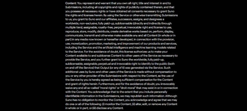 قوانین Suno از بقیه هم تند و تیزتر است. آنها حتی پا را فراتر گذاشته و از شما میخواهند که از تمامی «حقوق معنوی» (Moral Rights) خود نسبت به اثر تولید شده صرفنظر کنید. با این توصیف، فرقی نمیکند چقدر خلاقیت به خرج داده باشید؛ در سونو شما مالک واقعی خروجی نخواهید بود.