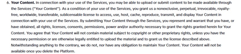 همانطور که اشاره شد، شما عملاً محتوای خود را به کپکات تقدیم میکنید. آنها میتوانند محتوای شما را بازنشر کنند، تغییر دهند و حتی حق استفاده از آن را به شرکتهای زیرمجموعه خود واگذار کنند. تقریباً هیچ کاری نیست که آنها نتوانند با محتوای شما انجام دهند و این واقعاً ترسناک است.