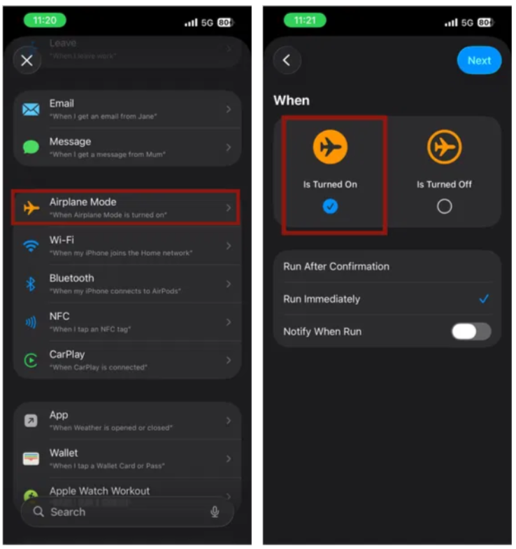 ۳. در لیست به پایین اسکرول کرده و Airplane Mode را انتخاب کنید. مطمئن شوید گزینه Is Turned On تیک خورده است و Run Immediately را انتخاب کنید.