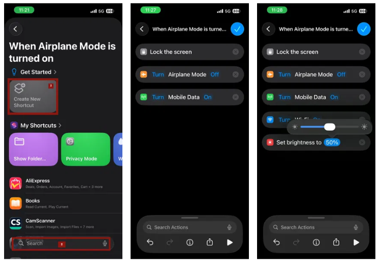 برای مقابله با این وضعیت، پیشنهاد میکنم از برنامه Shortcuts اپل استفاده کنید تا چیزی شبیه به یک تله بسازید. اگر کسی حالت پرواز را روشن کند، گوشی شما فوراً او را خارج کرده و اینترنت را دوباره فعال میکند: