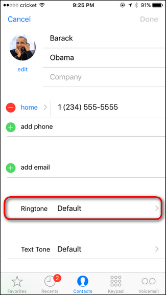 در ios صفحه شخصی مربوط به هر مخاطب را باز کنید و اهنگ زنگ مربوط به او را مشخص کنید . در ios این کار را با لمس گزینه ringtone در صفحه اصلی هر مخاطب انجام دهید در این صفحه بعد از انتخاب گزینه Ringtone اهنگ زنگی که ما اپلود کرده ایم یا خود ساخته اید را انتخاب کنید.