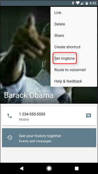 در اندروید وارد برنامه مخاطبین شوید مخاطب خود را انتخاب کنید مانند تصویر سه نقطه یا همان گزینه را لمس کنید و گزینه Set Ringtone را انتخاب کنید .