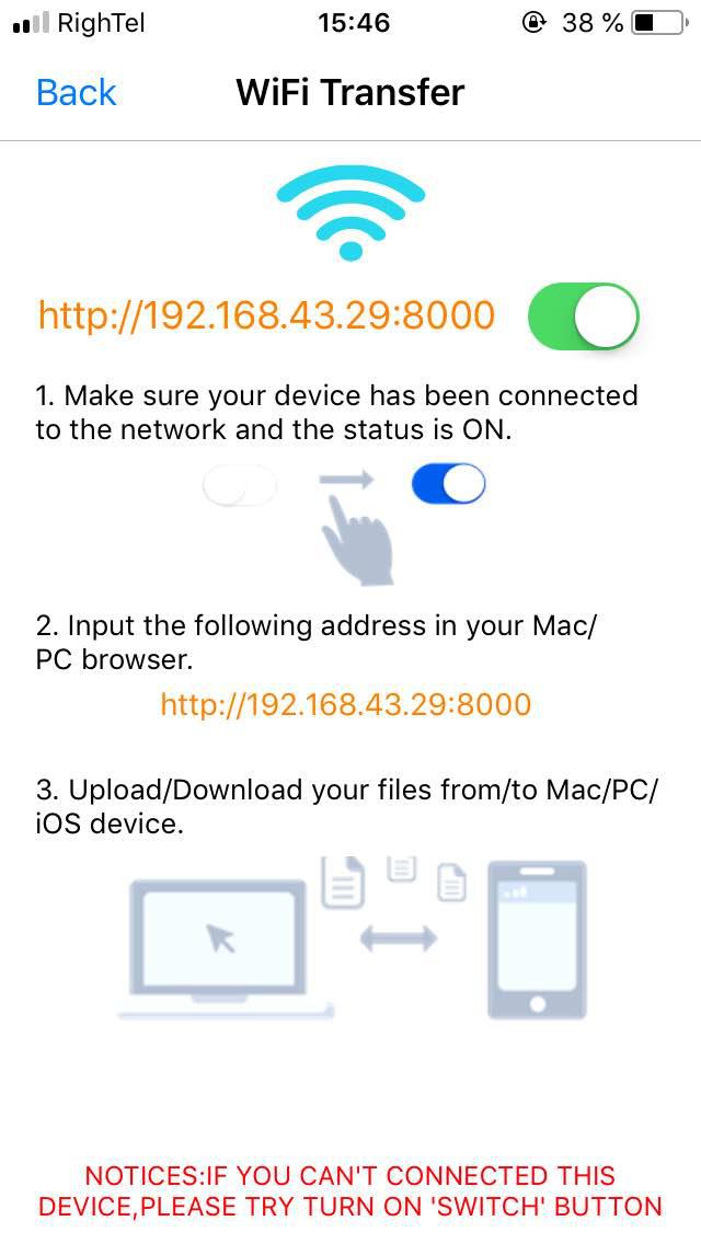 حالا وارد مرورگر لپ تاپ بشوید و دقیقا اعداد گفته شده را در URL مرورگر وارد کنید و اینتر را بزنید. سپس پنجره ای باز میشود که می توانید اطلاعات را بین موبایل و کامپیوتر خود انتقال دهید.